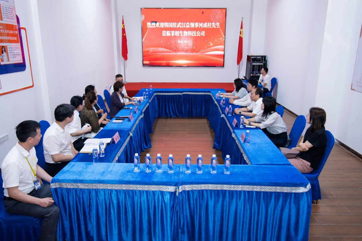 6月12日,韩国驻武汉总领事河成柱莅临菲朗生物调研。荆门市委副书记、市政法委书记赵少莲,荆门高新区党工委副书记、掇刀区委副书记、区政法委书记张龙等荆门市、区政府领导陪同调研;菲朗生物科技董事长权宁子女士全程热情接待。